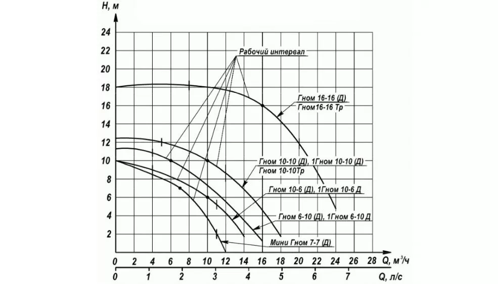 Графические характеристики дренажного насоса ГНОМ 16-16
