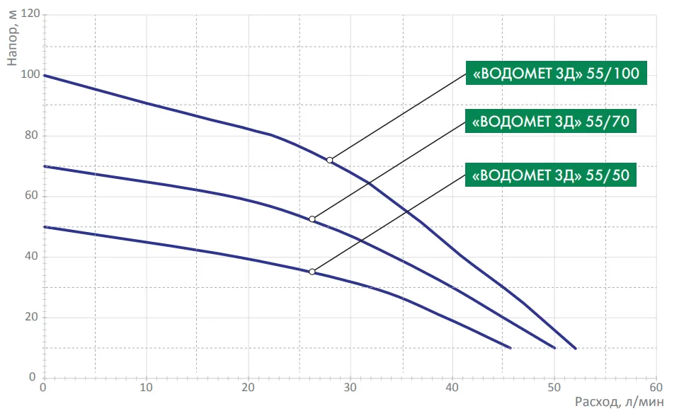 Насос ДЖИЛЕКС ВОДОМЕТ 3Д 55/50 предназначены для подачи чистой воды из скважин, колодцев, резервуаров и открытых водоемов, комплектации систем автоматизированного водоснабжения, полива и орошения.Графические характеристики насоса