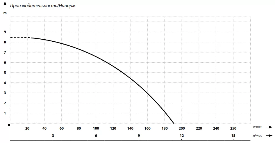 Максимальный напор: Насос имеет максимальный напор в 8,5 м, что позволяет перекачивать воду на значительные расстояния и высоты.
