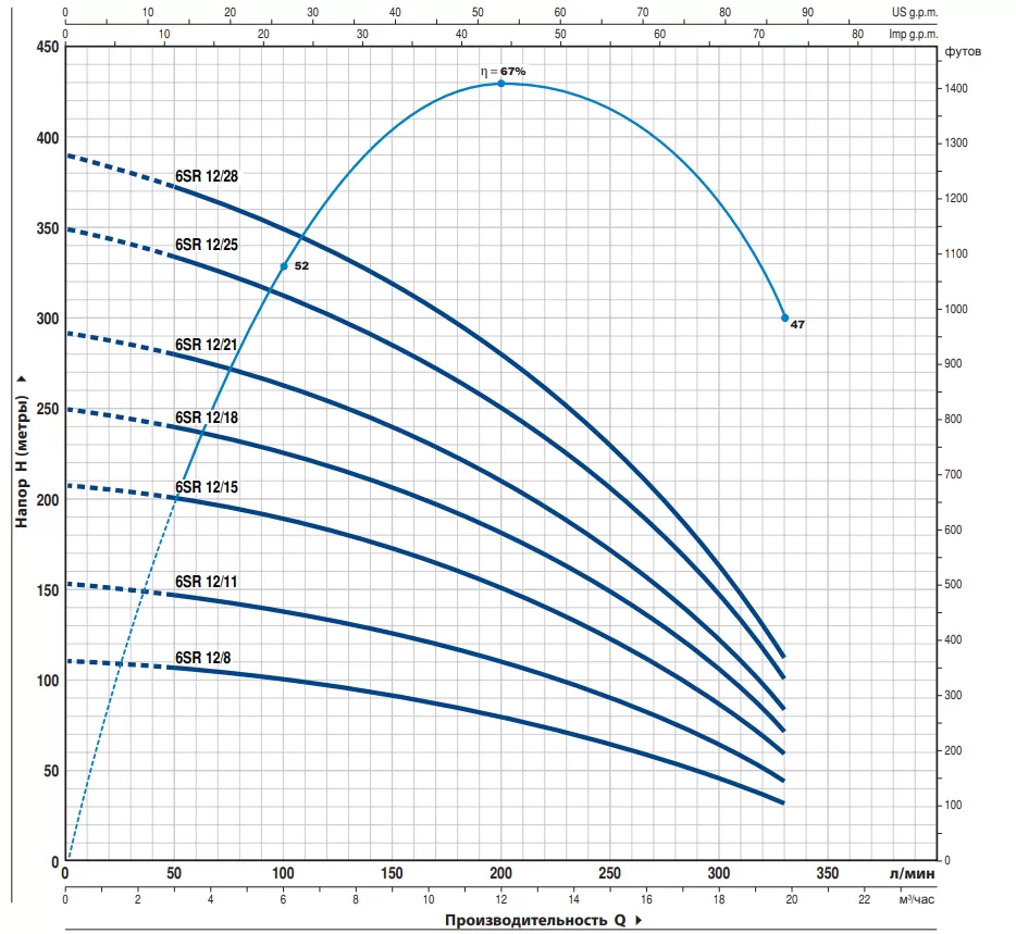 Глубинный насос Pedrollo 6SR12/11-P, отличается объективной ценой и надежной работой всех исполнительных механизмов. Насос Pedrollo 6SR12/11-P достаточно простой в эксплуатации и обслуживании, поэтому отлично подходит как для домашнего, так и промышленного применения.В основе работы Pedrollo 6SR12/11-P лежит конструктивно простой, но функционально успешный многоступенчатый центробежный принцип. Электрический двигатель подключается к агрегату через суппорт, в соответствии с нормативами международного стандарта NEMA. Мощность электродвигателя насоса составляет 5500 Вт . И при таких показателях мощности насос обладает максимальным напором в 153 метров и максимальной производительностью 19.8 м3/час. Функционирование Pedrollo 6SR12/11-P идентично большинству устройств, основанных на центробежных механизмах подачи воды. Жидкость втягивается в корпус устройства благодаря центробежной силе, создаваемой рабочими колесами, которые также проталкивают воду через все тело насоса "диаметр насоса 6"", а затем в нагнетающий патрубок "диаметр патрубка 3"", через который вода и попадает к конечному потребителю. Главной особенностью насоса Pedrollo 6SR12/11-P является малый диаметр корпуса агрегата, а также то, что перекачиваемая вода не касается стенок двигателя. Между жидкостью и корпусом движущей установки располагается прослойка из технологического масла, которая и предотвращает попадание мелких частиц непосредственно в исполнительный механизм. В то время как охлаждение электропривода происходит за счет верхнего способа забора воды, т.е. перекачиваемая жидкость находится всегда выше уровня расположения двигателя. Насос питается от сети в 380 в и комплектуется кабелем 4 метров.