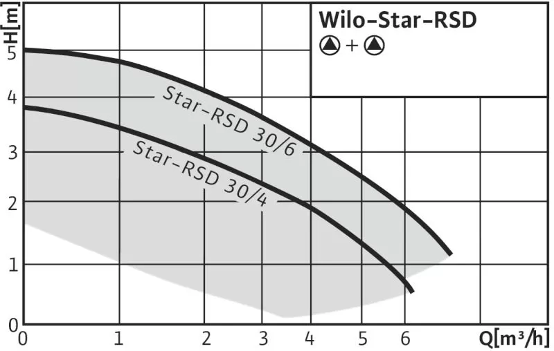 Сдвоенный циркуляционный насос WILO STAR-RSD 30/6 с мокрым ротором в общем корпусе с перекидным клапаном для установки в трубах. С ручным трехступенчатым переключением частоты вращения. Устойчивый к токам блокировки электродвигатель. Корпус насоса из серого чугуна, рабочее колесо из полипропилена, вал из нержавеющей стали с угольными подшипниками скольжения с металлической пропиткой.